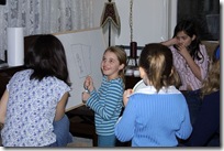 This evening, we hosted a Christmas party for the kids. We had a dozen girls, ranging in age from about 5 to 15. There was English Muffin pizzas, mozzarella fingers, and jalapeno poppers. They played a game of Christmas carol Pictionary, had some ice cream sundaes and banana splits, and then a game of Cranium. The evening concluded with a gift exchange.